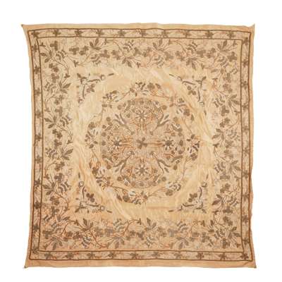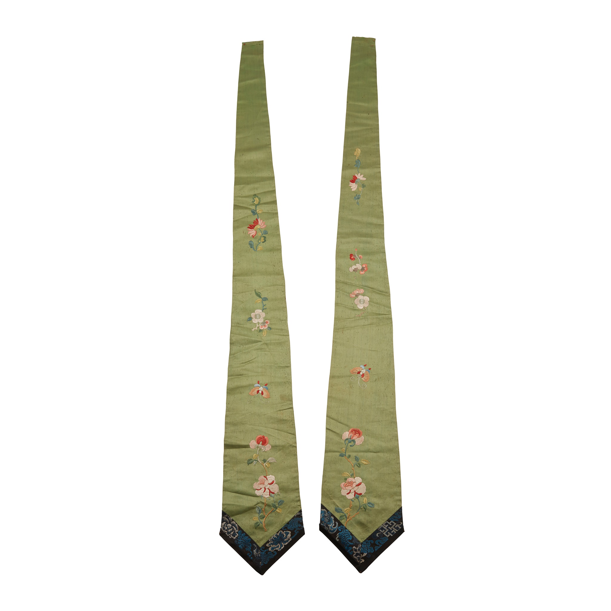 comprising: a persimmon ground silk embroidered 'Hundred Birds' hanging panel, 63cm x 97.5cm; a pair of olive-green ground silk embroidered 'Floral' hanging steamers, 111cm high each; two goldthread and silk embroidered 'Floral' panels for the export market, symmetrically designed, the smaller mounted on paper, 106cm x 122.5cm and 50cm x 51.2cm