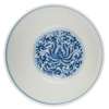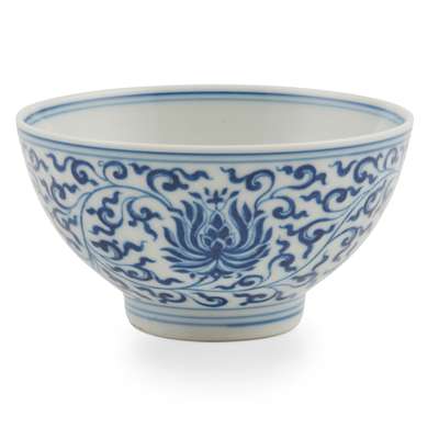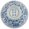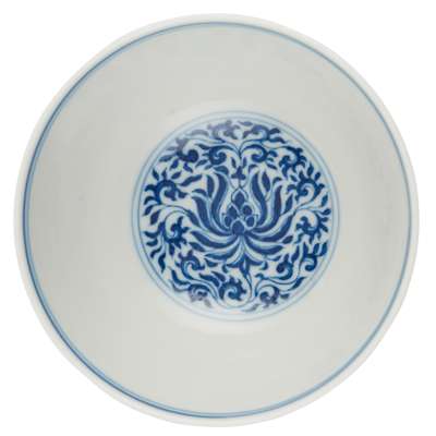the deep rounded sides painted with lotus in tendrils, all between two bands of concentric circles on the foot and mouth rim, the interior further decorated with a leafy lotus in double-circle, the base inscribed with a six-character Kangxi mark in double-circle
