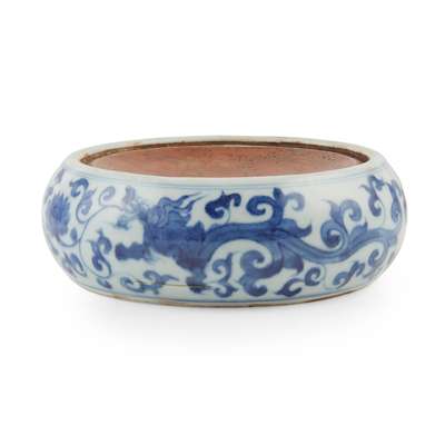 sturdily potted in drum form, painted to the exterior with a continuous scene of phoenix and kui-dragon amongst scrolling tendrils, the concaved top dressed in persimmon glaze with a small opening near the rim, the base painted with a lingzhi motif mark