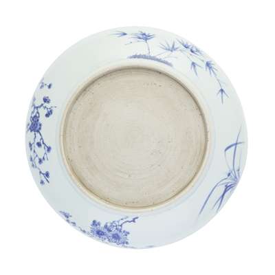 supported on a short straight foot, the interior fully decorated with small figures and houses in a mountainous landscape setting, the exterior decorated with 'four noble ones'- plum, orchid, bamboo, and chrysanthemum