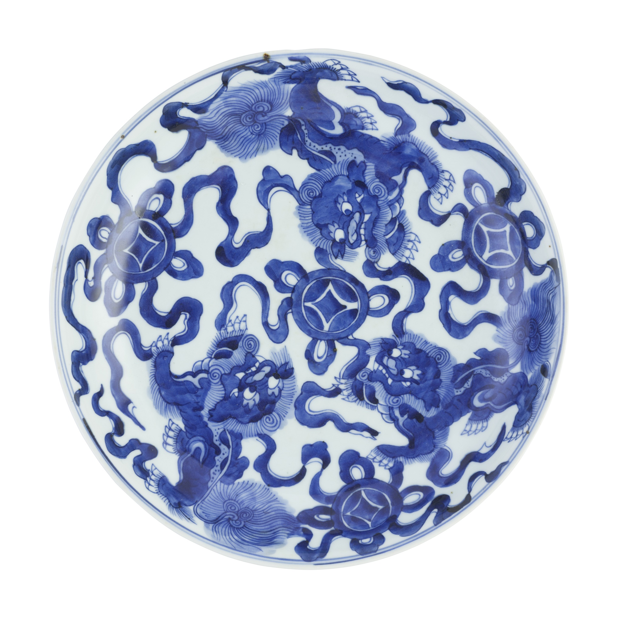 supported on a recessed short foot, the interior painted with three playful Buddhist lions chasing brocade ball stemming with tendrils, the exterior adorned with Buddhist Emblems