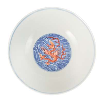BLUE AND WHITE WITH IRON-RED 'SEA CREATURES' BOWL
