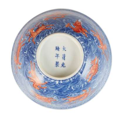 the deep rounded sides rising to a gently everted rim, the exterior with a continuous scene of mythical sea creatures against turbulent waves, the interior further decorated with a winged dragon in the central medallion, the base inscribed with a six-character Guangxu mark in underglaze blue