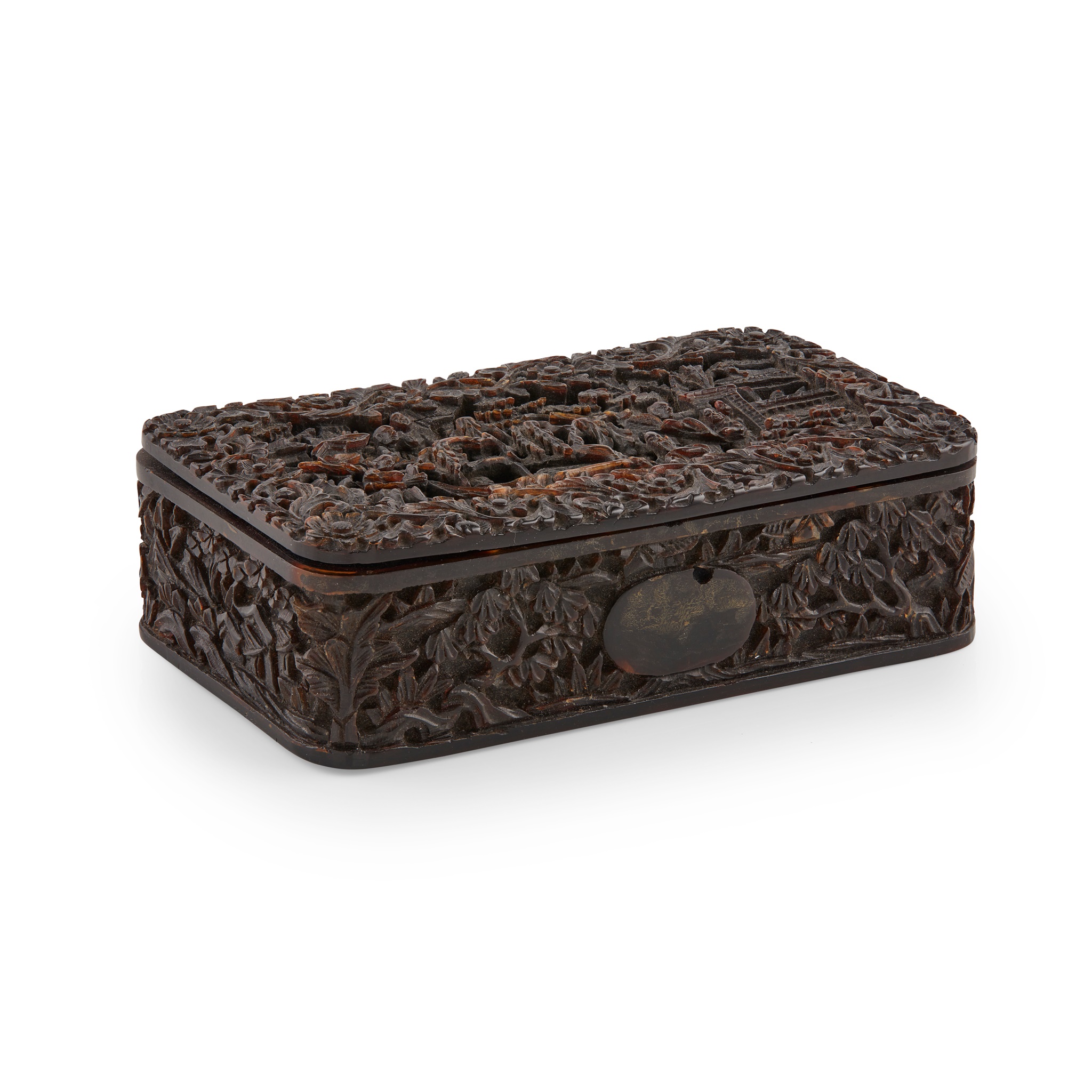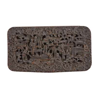 the hinged cover and bottom carved with figures by pavilions in a river landscape, sides with a continuous scene of landscape and houses