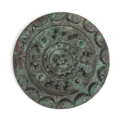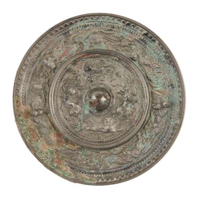 comprising: a 'Star and Cloud' mirror, Han dynasty, of circular shape, cast to the recessed central well with a sacred mountain knob encircled by stars connected by curvy clouds, enclosed by a band of semi-circular motif; the other a circular mirror, Tang dynasty or later, decorated to the recessed central well with a band of mythical beasts and bunches of grapes, the outer band with birds and grapes