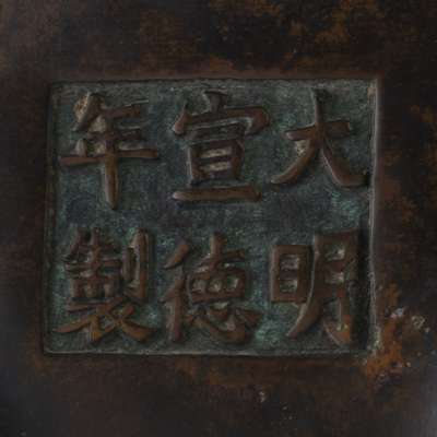 宣德款 銅鑄冲耳三足爐帶木蓋嵌玉鈕