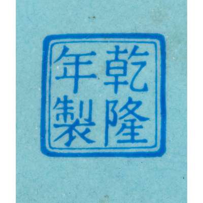 painted on the domed body with Ashtamangala alternating with floral heads, all against a yellow ground, the base inscribed with a four-character Qianlong mark within double squares against a turquoise ground