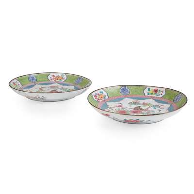 each decorated to the centre with butterflies hovering and perching on peony, begonia, and morning glory sprays in a lobbed floriform cartouche against a blue interlocking Y-pattern ground, the border with floral and fruit panels intermittent with shou motifs on a lime-green diaper ground, three floral sprays further painted on the outer cavetto, the base boldly painted with a shou character flanked by twin stylised Kui-dragons in blue enamel