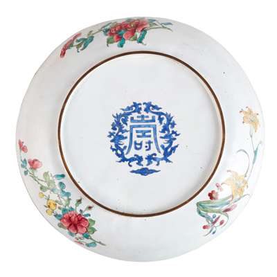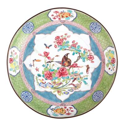 清 '壽'款 銅胎廣東畫琺瑯蝶戀花紋盤(一對)