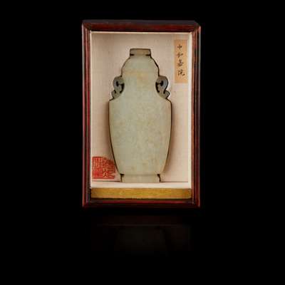 of flattened form, the decoration imitating archaic bronze vessels, each side of the body and neck finely carved in low relief with an archaic taotie mask, flanked by two ruyi handles, the stepped foot, mouth rims of the vase and the lid further incised with a band of key-fret pattern, with a fitted wooden box, the cover of the box inscribed with 'Nan Shan Xian Song 南山獻頌', wishing the receiver longevity