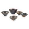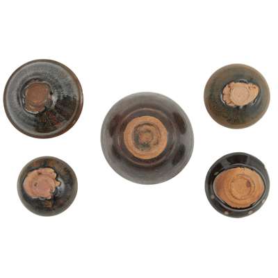 each of conical shape, comprising: one tea bowl covered in dark brown glaze, 14m diameter; one Jian-ware tea bowl with splayed mouth rim and covered overall in oil-spot glaze, 12.2cm diameter; two Jian-ware wine bowls in 'hare's-fur' glaze, 9cm and 10cm diameter; and one Jian-ware wine bowl in 'partridge-feather' glaze, 9.7cm diameter