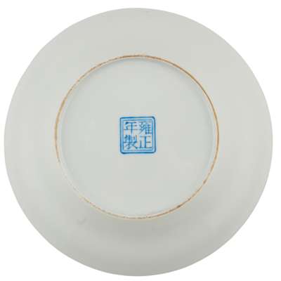 thinly potted from a recessed foot, gently waisted body and straight rim, the interior applied overall with a rich pink enamel, the counter-sunk base inscribed with a four-character Yongzheng mark within double square panels in blue enamel