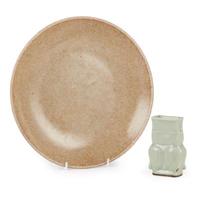 one vase of flattened rectangular form, the lower part of the body modelled with four petal-form decoration with pointed tips, the neck with a raised horizontal line, covered overall with a thick layer of celadon glaze, leaving only the foot ring left unglazed and covered in brown paint ; together with a ge-type crackled-glaze circular plate, covered overall with a thick layer of creamy glaze with ivory tinge and a web of fine russet crackles, leaving the foot rim unglazed
