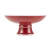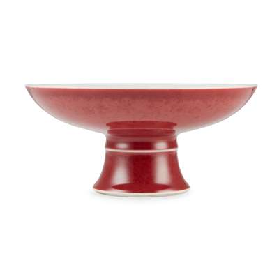 the shallow dish with slightly rounded, flared sides raised on a spreading pedestal foot encircled by a bow-string band, the exterior covered with a glaze of soft strawberry-red colour, the interior and base glazed white, the base inscribed with a six-character Qianlong mark in underglaze blue