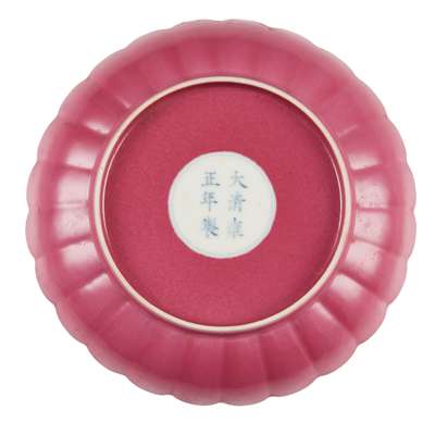 thinly potted on a short foot raised to wide lobed sides and foliated rim, covered overall save for the foot rim and central medallion on the base with thick vibrant pink glaze, the base inscribed with a six-character Yongzheng mark within double circles