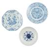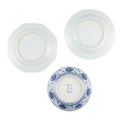 comprising: an octagonal plate decorated with flowers in a vase on the interior, surrounded by flowers on branches on the cavettos, 23cm wide; a circular plate painted overall with flowers, 22.5cm diameter; and a circular dish decorated with a lotus head on the interior and seven further flowers on the exterior, the base inscribed with a six-character Guangxu mark in underglaze blue, 19.7cm diameter