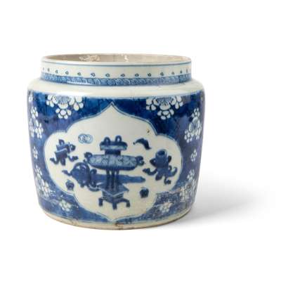 BLUE AND WHITE 'ANTIQUITY' PORRIDGE JAR