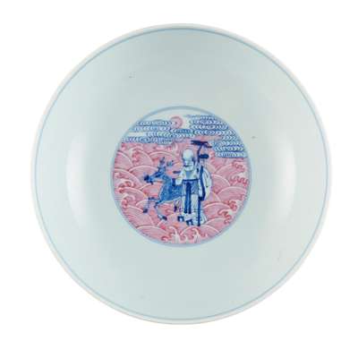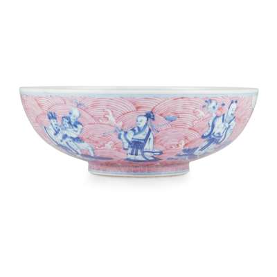 PUCE-ENAMELLED BLUE AND WHITE 'EIGHT IMMORTALS' BOWL
