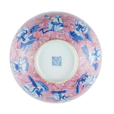 well-potted with rounded sides resting on a tapered foot, the exterior painted in underglaze blue with the Eight Immortals carrying their various attributes, riding on various sea creatures or plants, journeying across a ground of cresting waves in puce enamel, all above a key-fret band, the interior similarly decorated with a central medallion enclosing Shoulao and a deer amongst puce waves below scrolling clouds, all within blue line borders, the base inscribed with a six-character Daoguang mark in underglaze blue