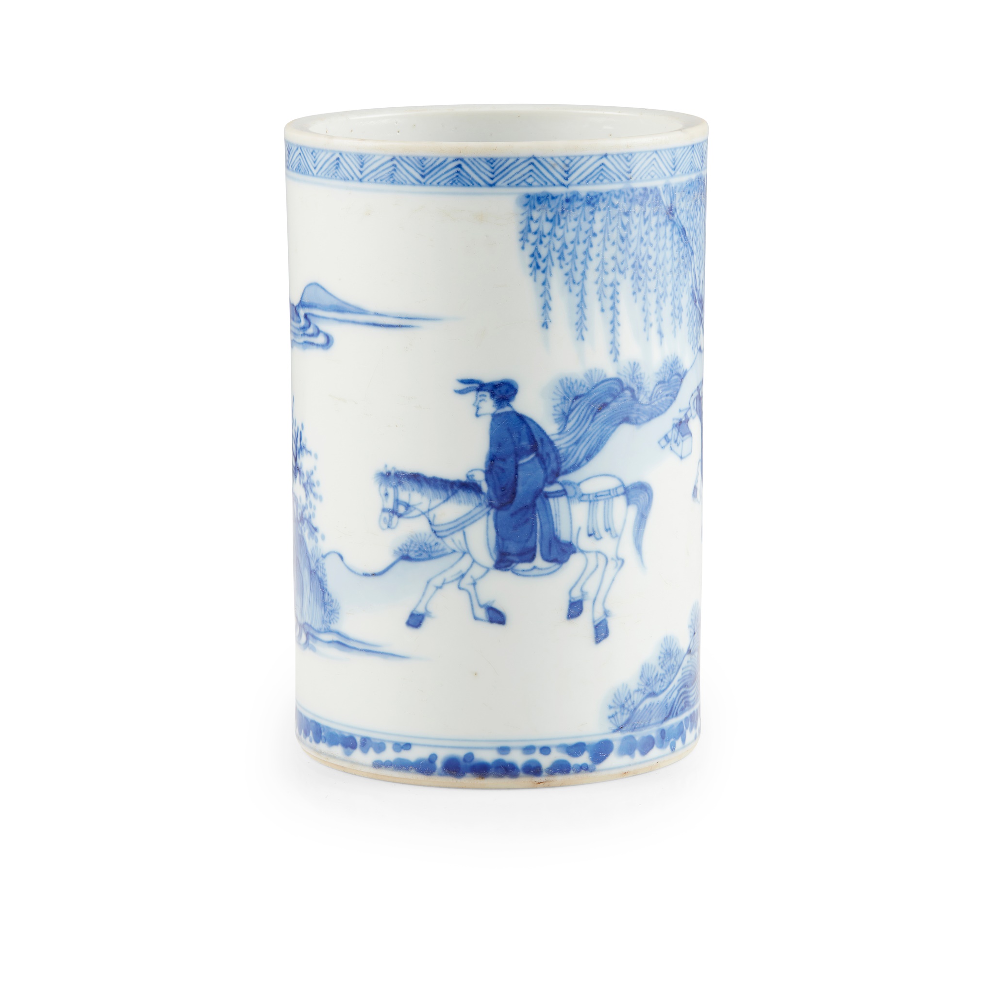 of cylindrical form, painted with a scholar riding a horse, his boy attendant behind underneath a willow tree carrying belongings