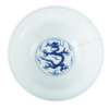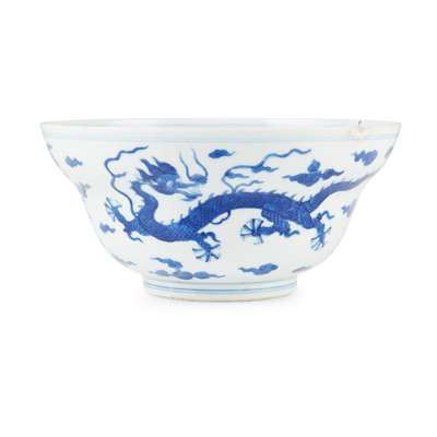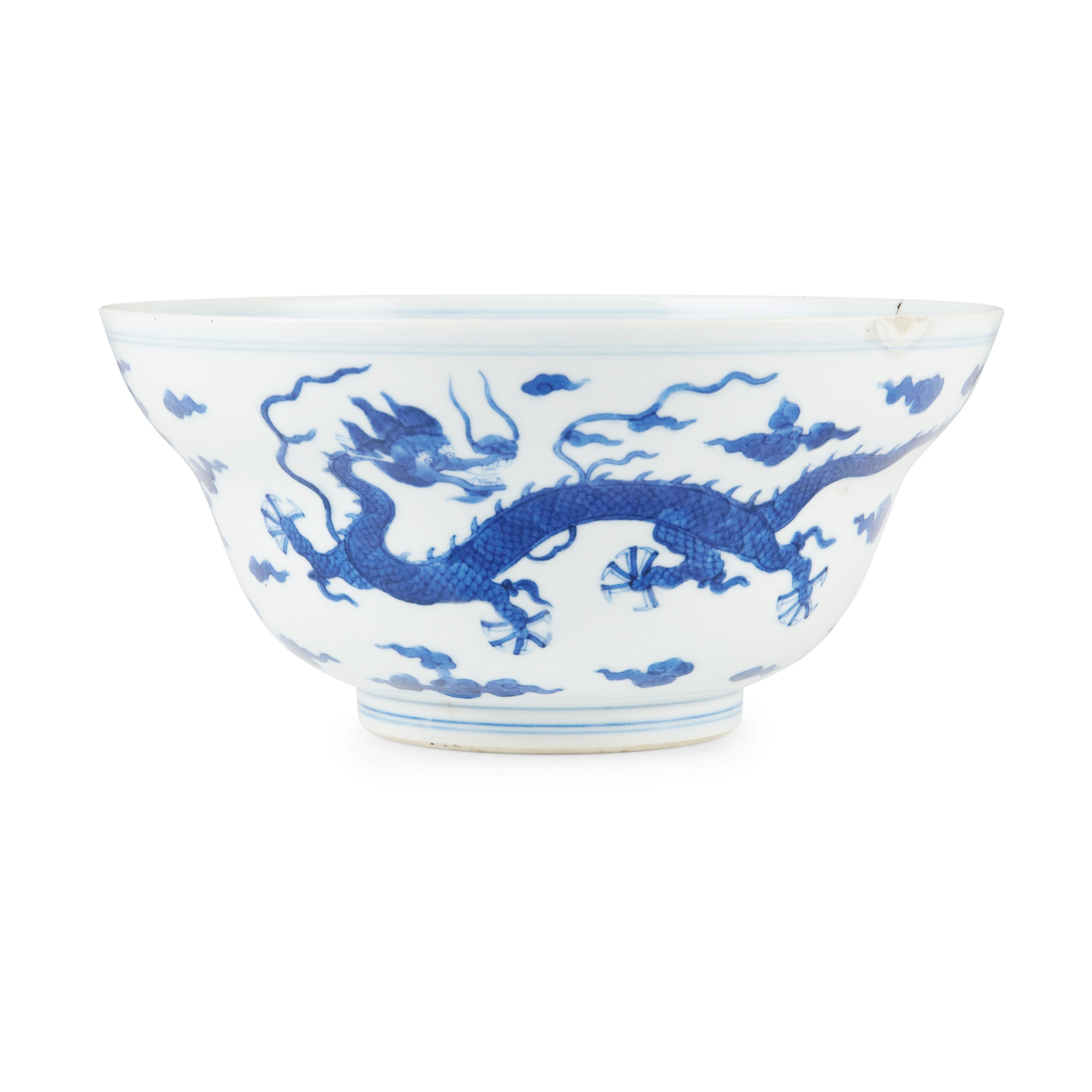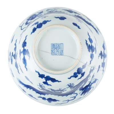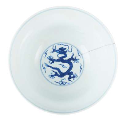 thinly potted on a short ring foot, rising to rounded sides waisted halfway and to wider mouth, the exterior painted with two five-clawed dragons amidst clouds, further with a coiling dragon in the central medallion of the interior, the base inscribed with a six-character Daoguang mark