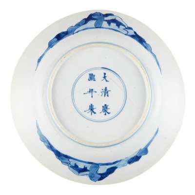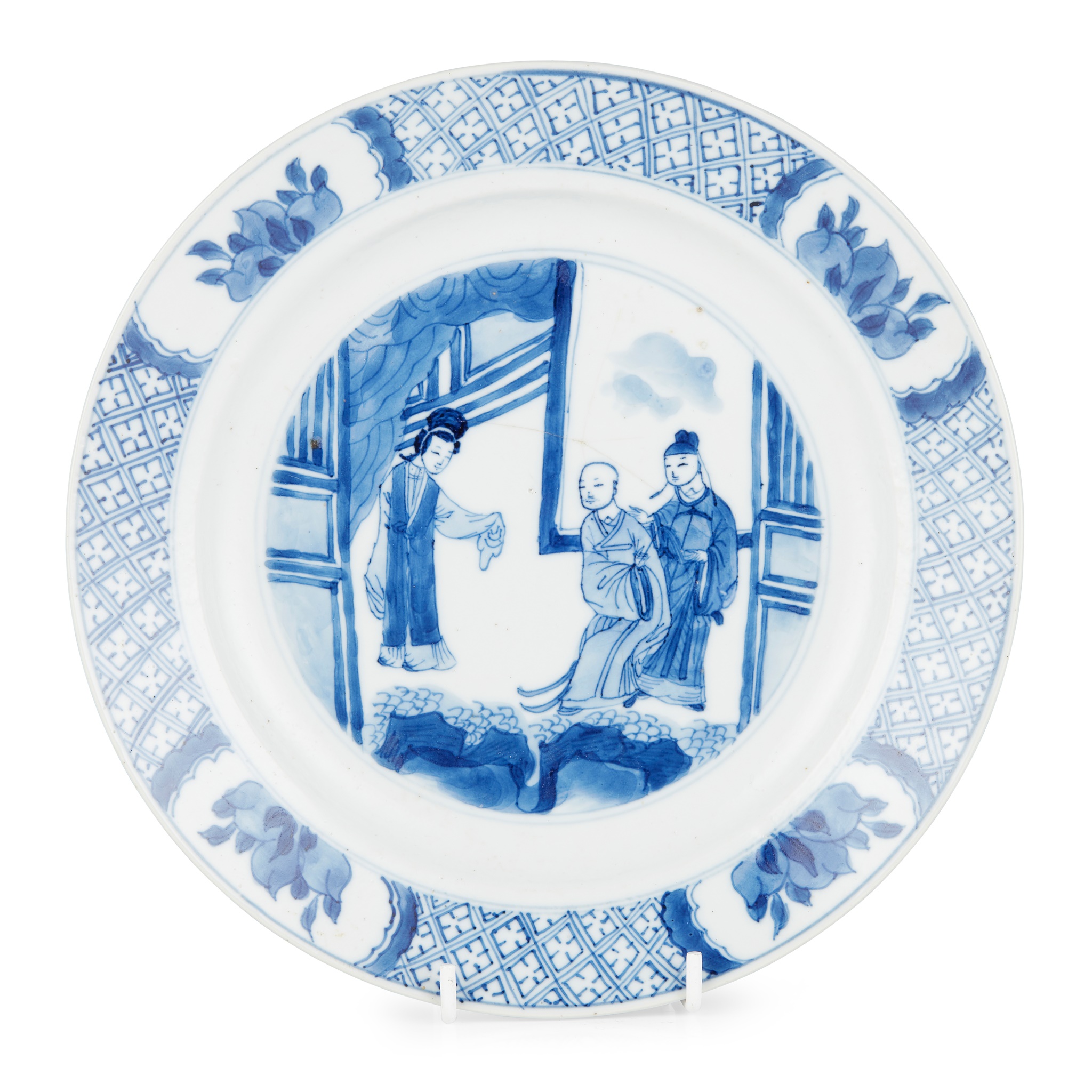 the centre of the plate painted with a lady receiving a monk and a literatus at a pavilion, the cavetto decorated with peaches with leaves in four cartouches against a geometric ground, the underside painted with a small house in a landscape setting on either side, the base inscribed with a six-character Kangxi mark in double-circle