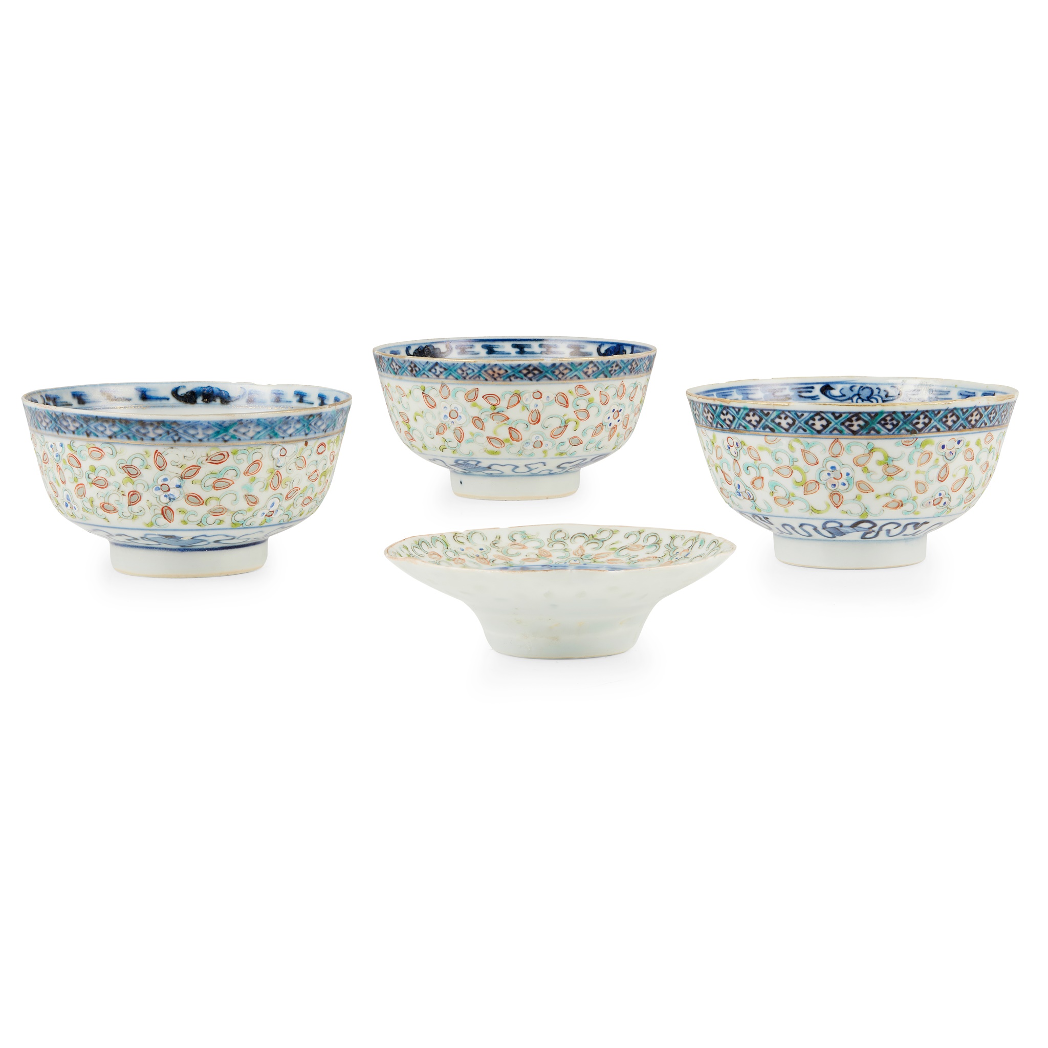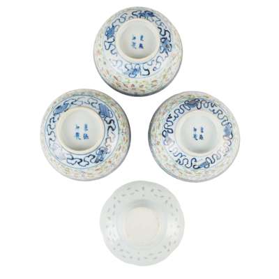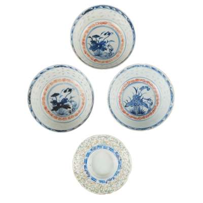 GROUP OF FOUR BLUE AND WHITE WITH FAMILLE ROSE 'RICE GRAIN' WARES