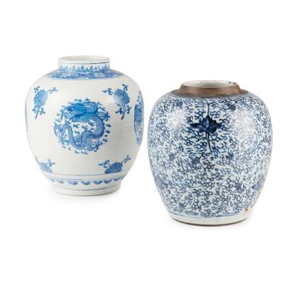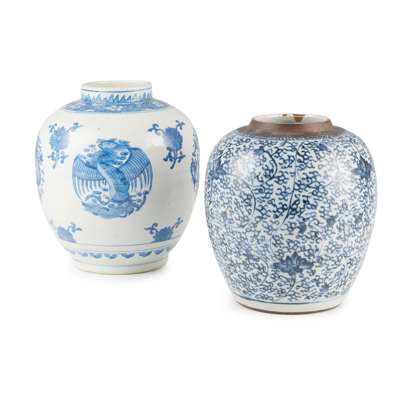 one Yongzheng period jar decorated with lotus with swirling tendrils, the base inscribed with double-circle; the other 20th-century soft-paste jar painted with four roundels with dragons and phoenixes, all below a band of cracked ice and prunus pattern on the shoulder