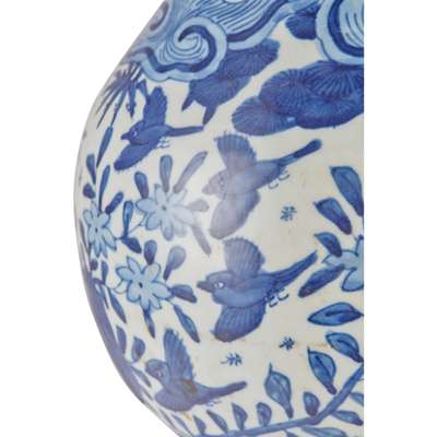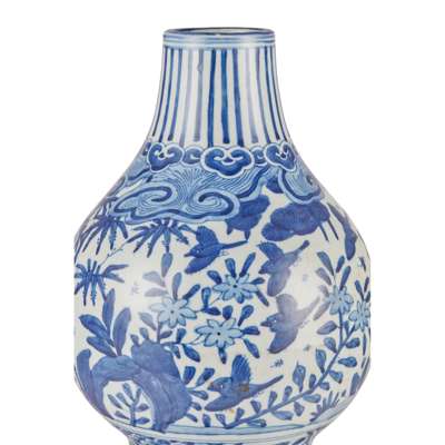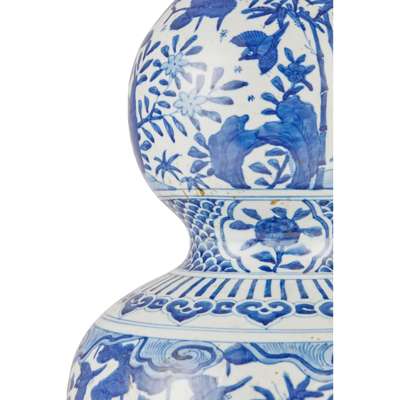 sturdily potted on a countersunk base to a large bulbous body, waisted centre further with a smaller bulb tapering to smaller mouth, two bulbs similarly painted freely with birds in floral sprays, pine trees, bamboo grooves, and rockwork, the centre with three floral cartouches reserved on a wavy ground above a ruyi-lappet band, similar band around the mouth, the base unglazed