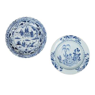 清康熙 青花花卉樹石紋盆 及 清或以後 青花高士弈棋圖大盤