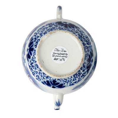 one of melon form, Kangxi period, attached with a looped handle and straight spout on either side, the ribbed body and dome cover both painted with various flowers on branches; and one of globular form attached with a looped handle and an animal-form spout, the body painted with figures in landscapes, the cover with an animal figure