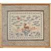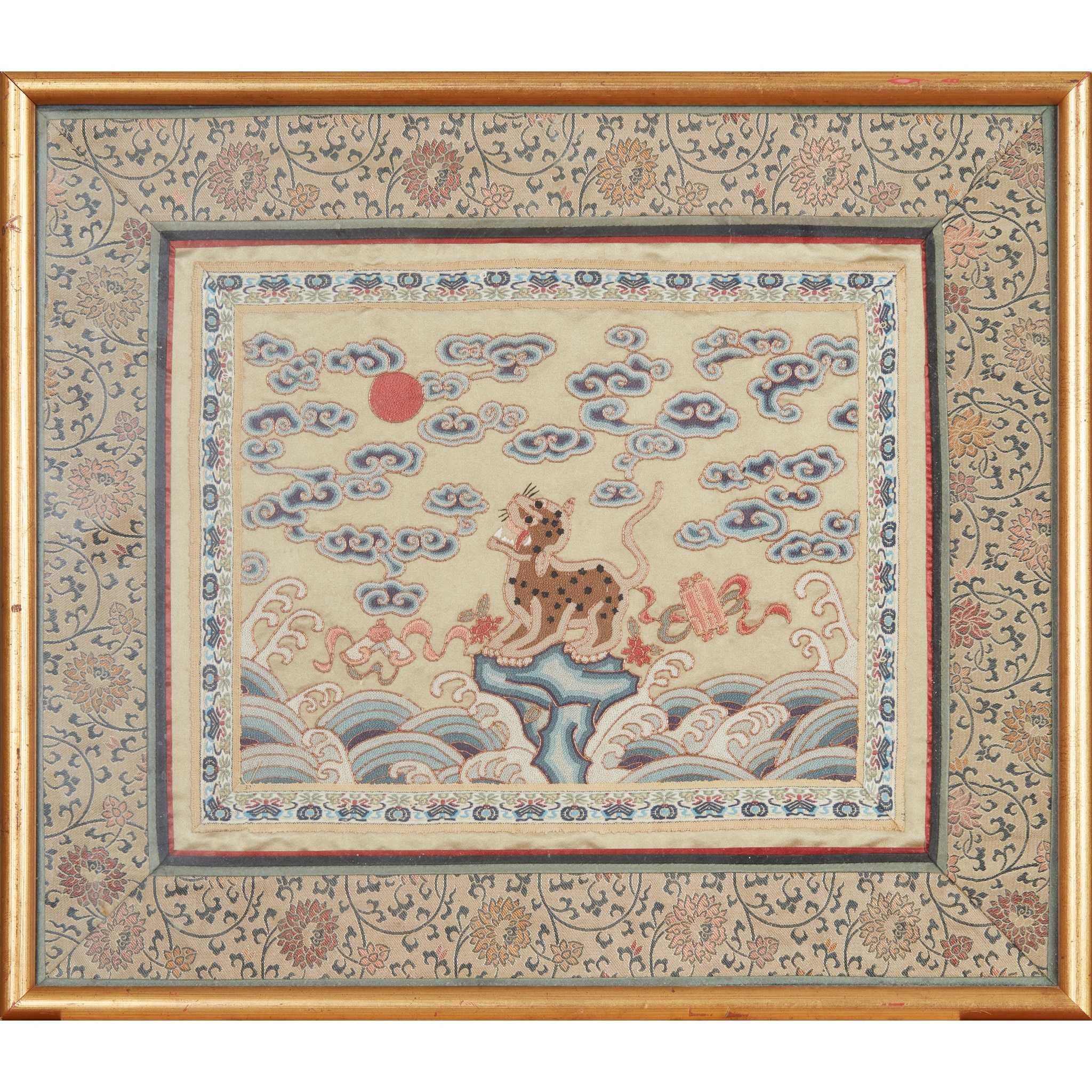 depicting a howling leopard surrounded by auspicious emblems borne on ribbon standing on all fours on rockwork rising from crashing waves, the sky with ruyi-cloud and sun, all decoration in Peking Knot outlined by gold thread, the border adorned with lotus flower heads borne on tendrils, framed