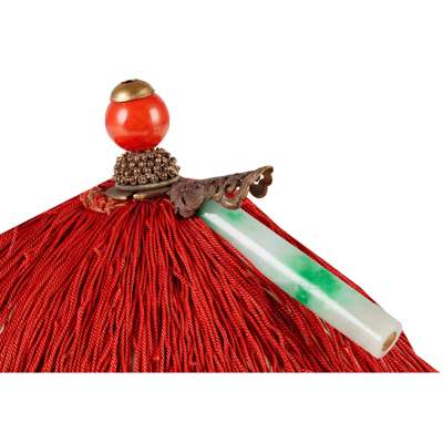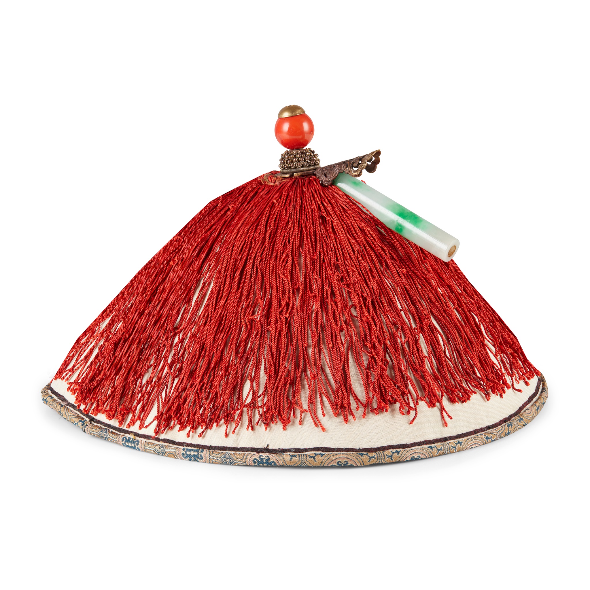 of conical form, the creamy ground overlaid with red threads, wide edge bound with patterned silk roll, lined in burgundy fabric, topped with a red bead finial and jade tube