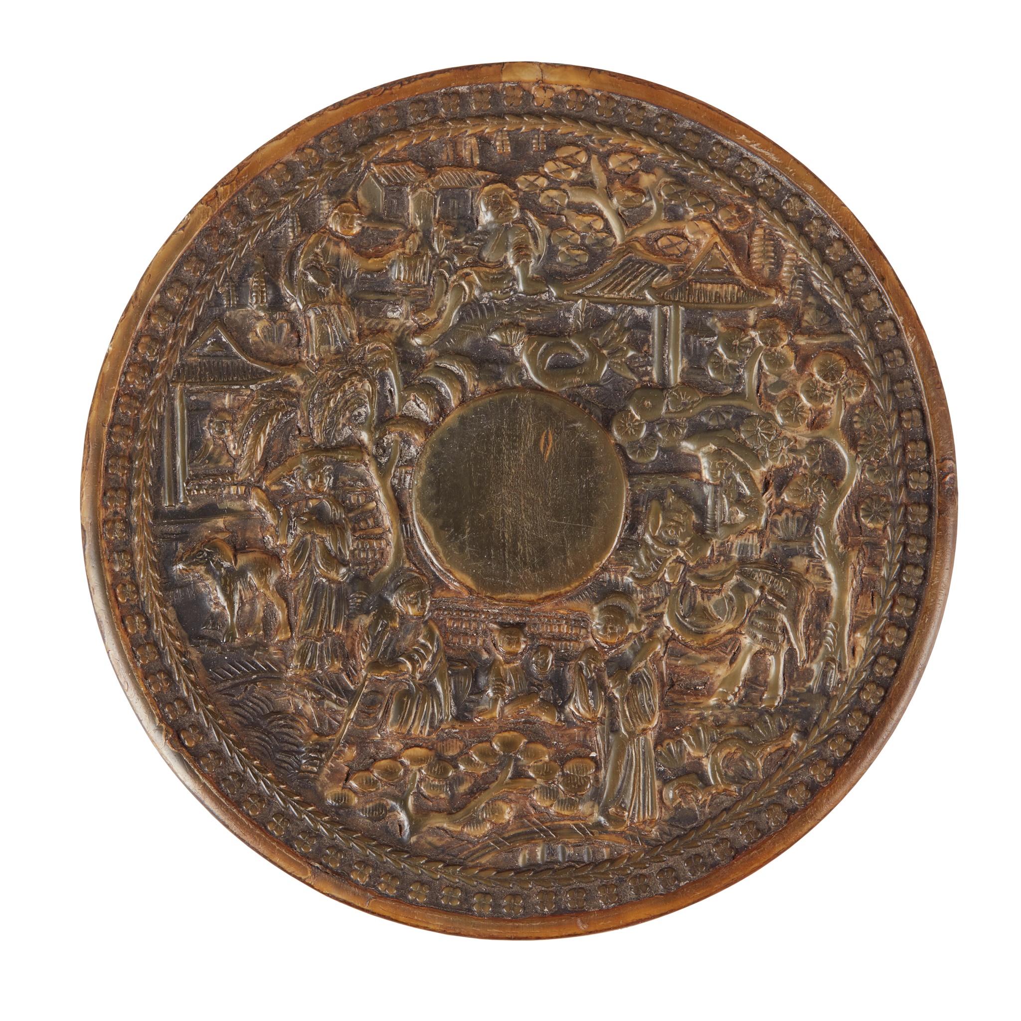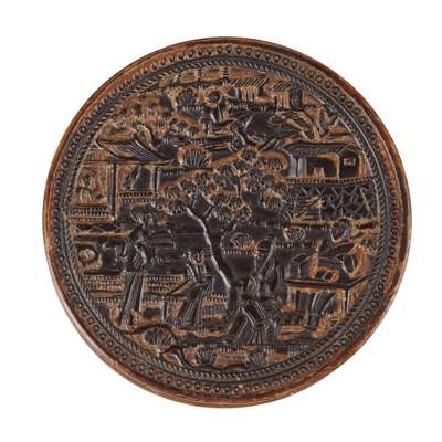 清末民初 玳瑁雕人物閣樓紋圓蓋盒