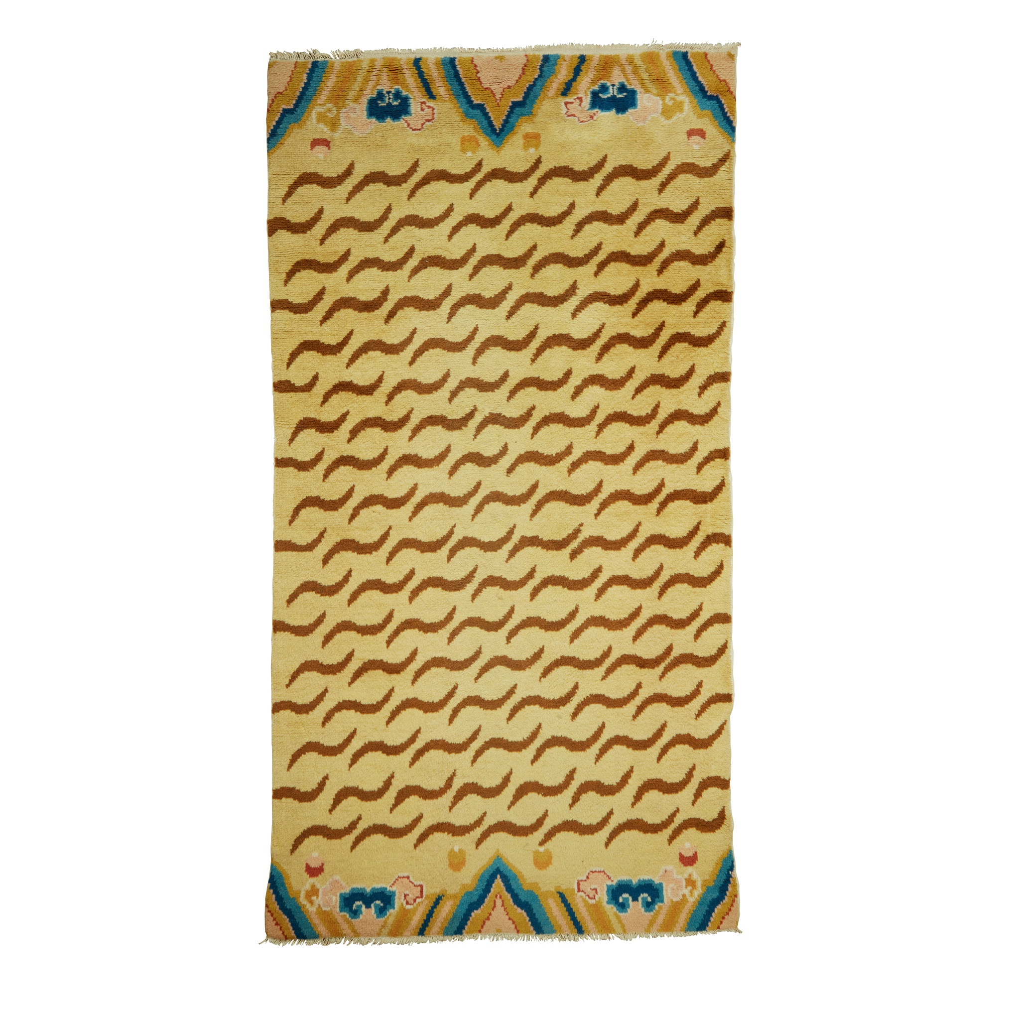 woven with abstract tiger strips in light brown on a honey-gold ground, either end decorated with rocky mountains and crashing waves