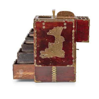 a narrower side with five gradual drawers, reverse and right sides each with a detachable rectangular box sectioned and opened from top, the top with an opening to a storage, handle to the middle, a small pocket with plaque-handle cover to one side, overall with decorative metalware