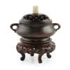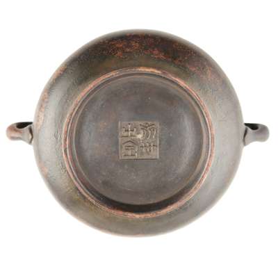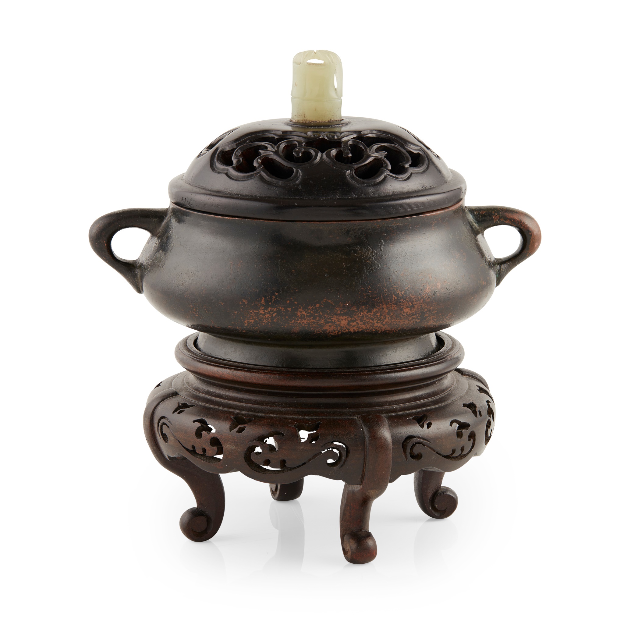 of compressed globular form, rising from a short splayed foot to gently everted rim, set with two loop handles, the base cast with 'Yong Shi Zhi Bao' (treasure of eternity) in a recessed square panel, with a fitted wooden stand and cover, the cover set with a pale celadon jade carving of a 'bamboo' finial