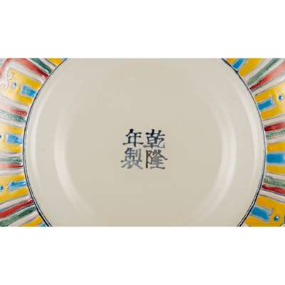 supported on a short tapered foot, the bulbous body painted with three dragons above swirling waves, all below a lotus band on the shoulder, the elegant neck adorned with plantain leaves, a band of ruyi-head pattern further decorates the everted mouth rim, the base inscribed with a four-character Qianlong mark in blue