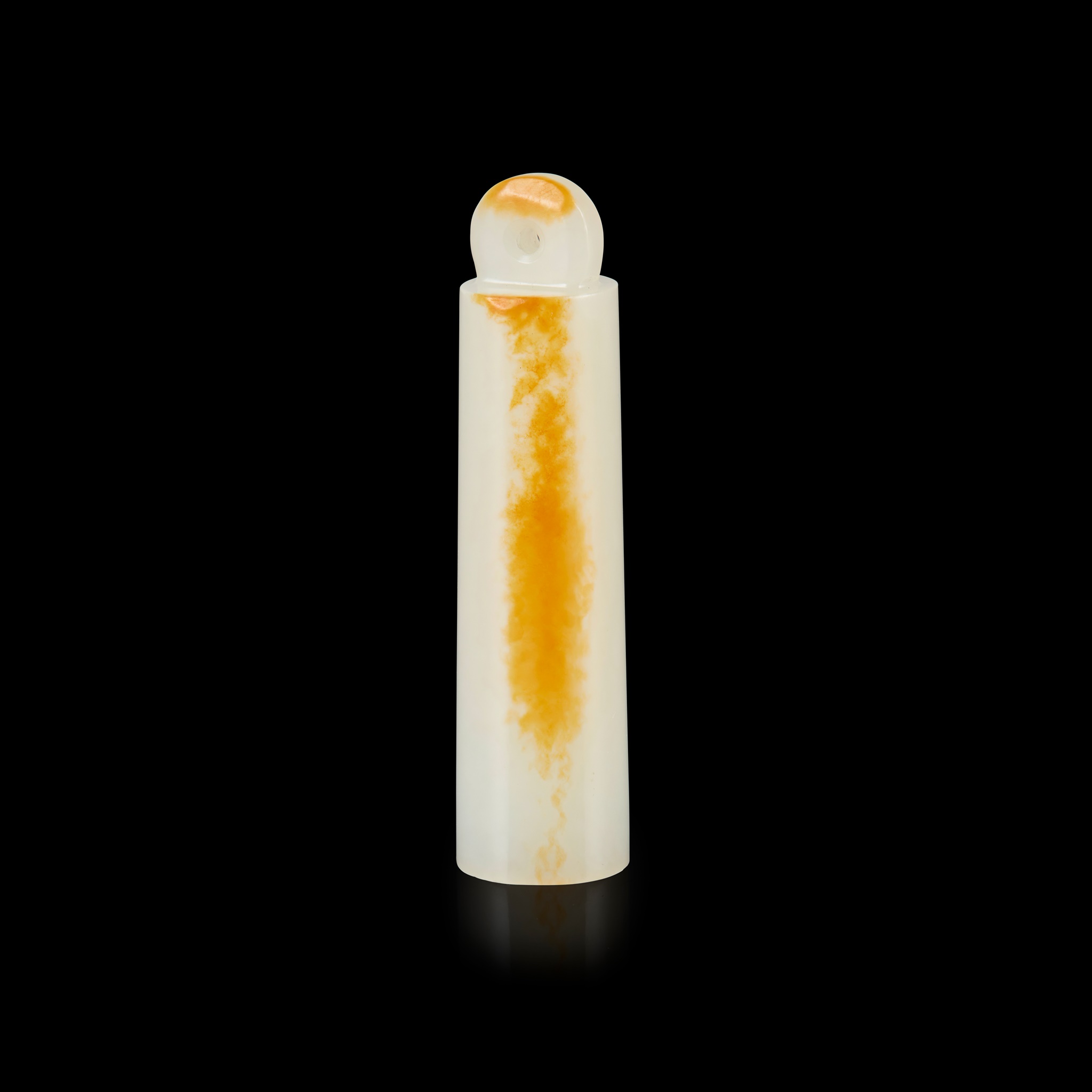 of tapering cylindrical form, the stone of even translucent white colour and save to one side with russet skin