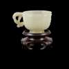 carved in low relief with a band of bosses above a line, raised on gently flaring foot, waisted lipped rim, one side with articulated 'lingzhi' handle, the stone of a translucent greenish-white tone, with a carved wooden stand