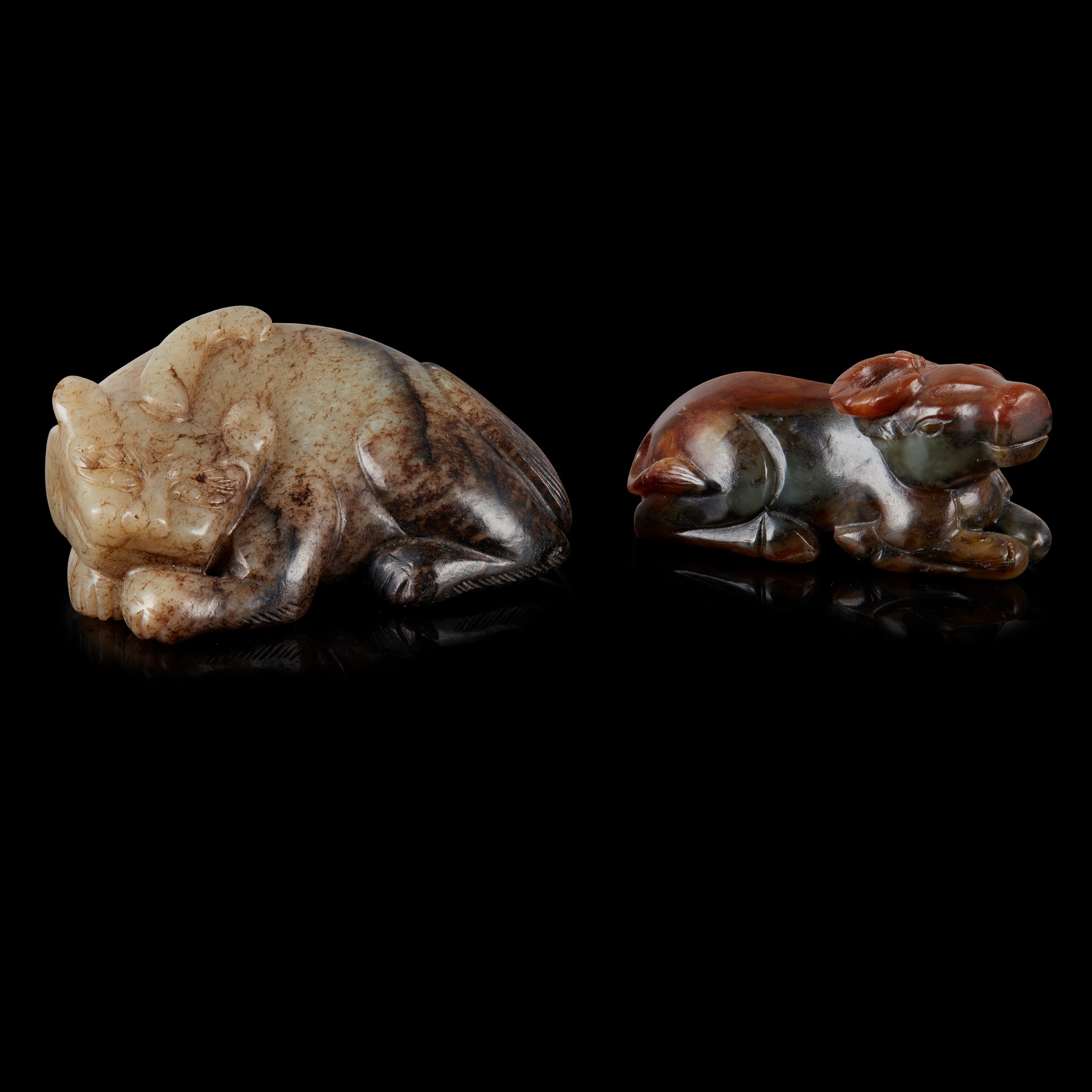 comprising: a celadon and black jade carving of a unicorn mythical beast luduan in seated position, the minutely carved head turning to its left and resting between his two forelegs, the bushy tail wrapping around its hind leg; and a smaller celadon with russet skin jade carving of a recumbent buffalo with two large horns