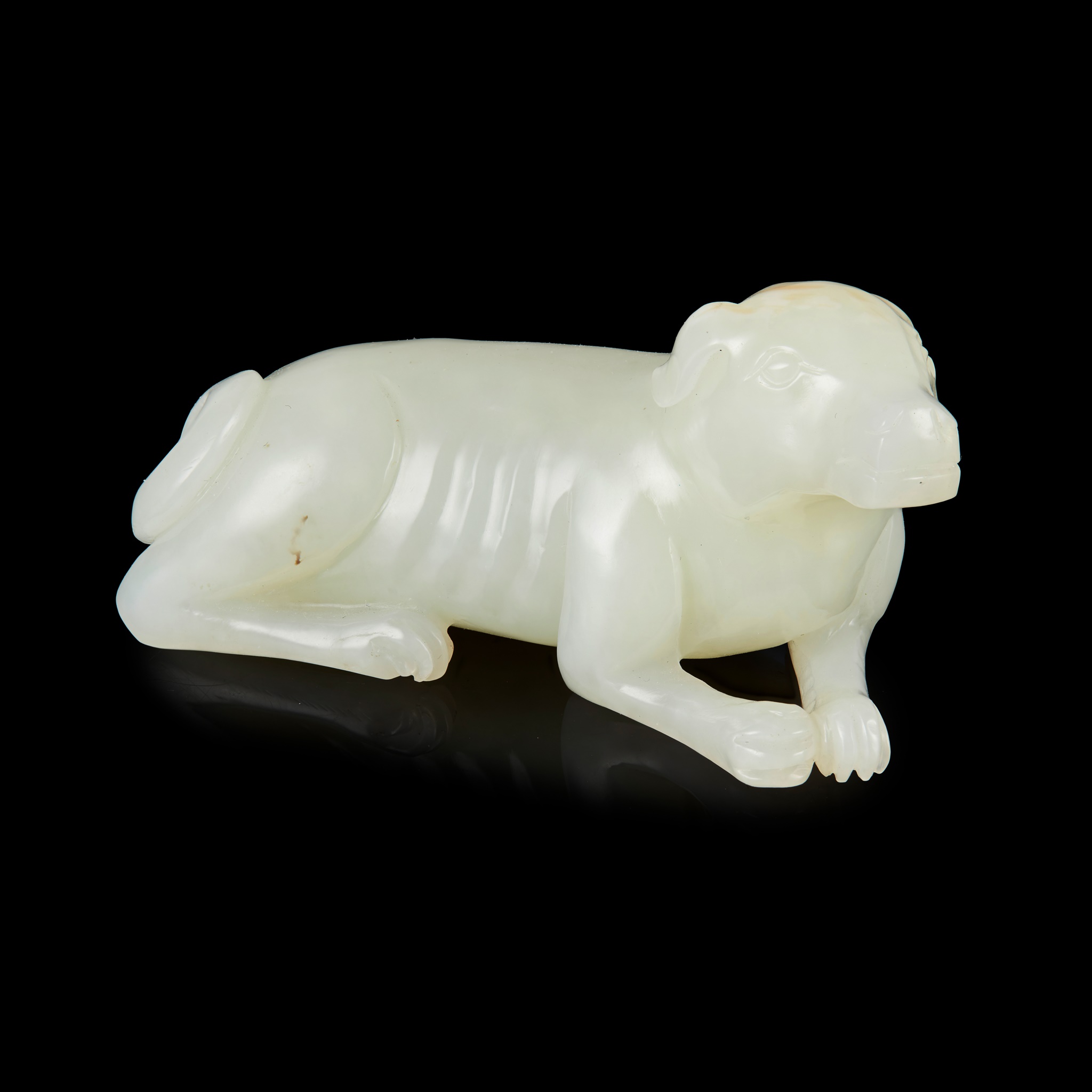 carved as a slender recumbent dog with its head slightly raised to its right above two front legs, ears tucked down, tail coiling on rear hind, the stone of translucent white colour with patches of light brown skin, especially on its rear hind and its head
