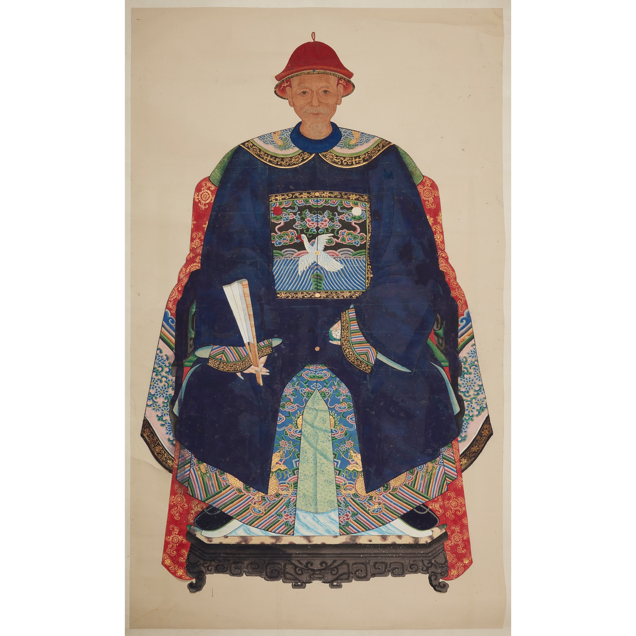 ink and colour on paper, painted with a seated male, possibly fourth-ranked, court official holding a folded fan in his right hand, a European pocket watch in the left, wearing a black robe with a white bird badge, the painting cut out and mounted on paper