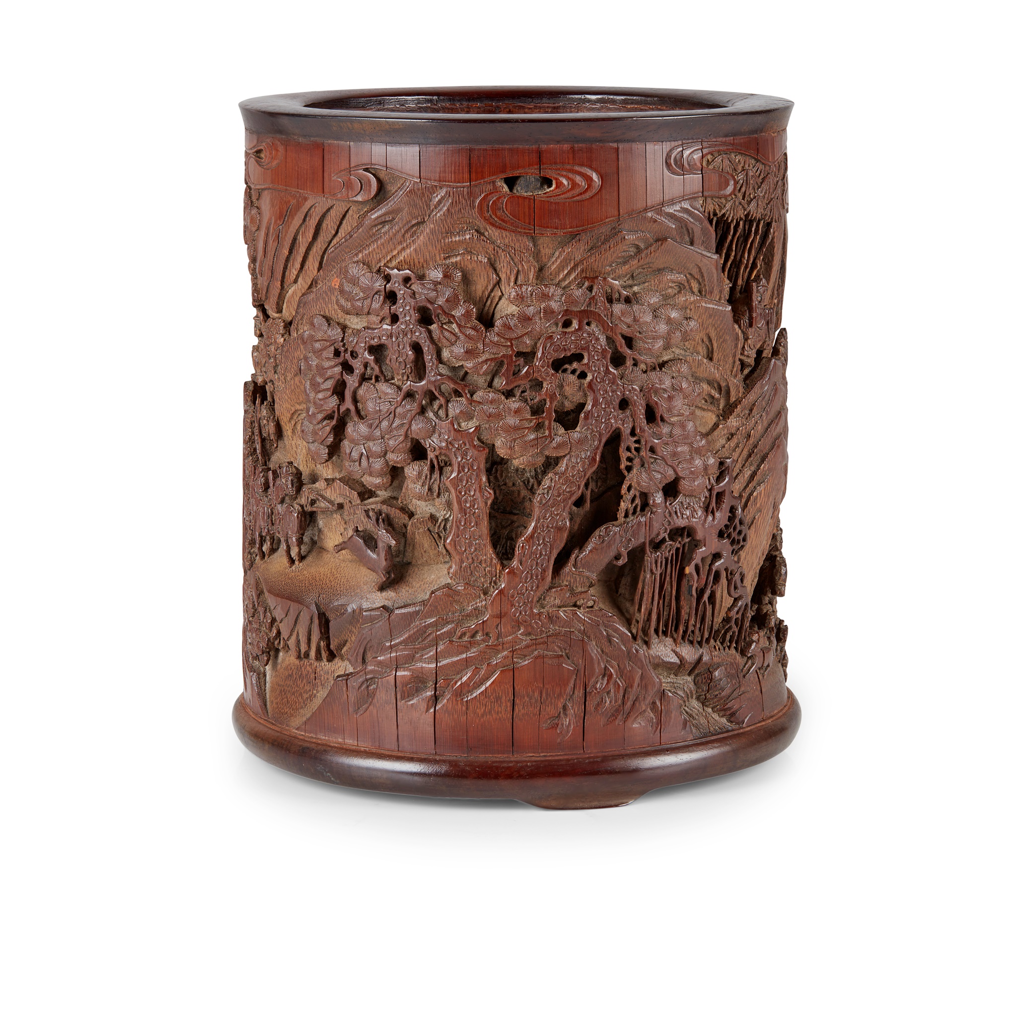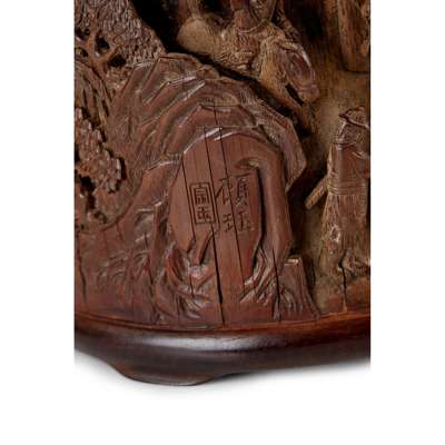 deeply carved in openwork and several reliefs with a continuous scene of equestrians hunting in a forest dense with bamboo grooves, pine and other trees, incised on one lower side with 'Gu Yu', further with 'Zong Yu' in a panel, mounted with wooden rim and base with three feet