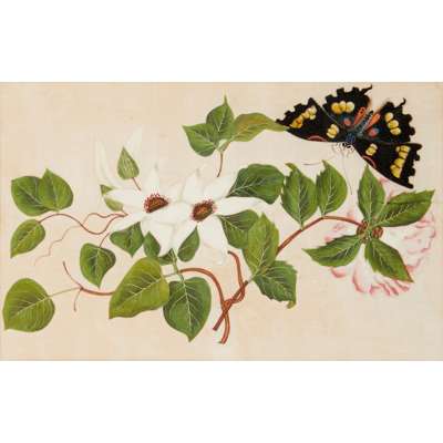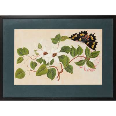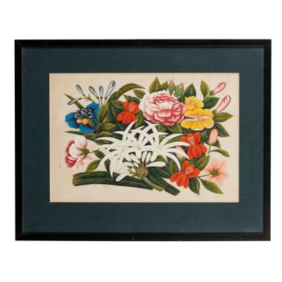 gouache on pith papers, each depicting a luscious floral bush and one visited by a butterfly around exotic flowers, in wooden frames