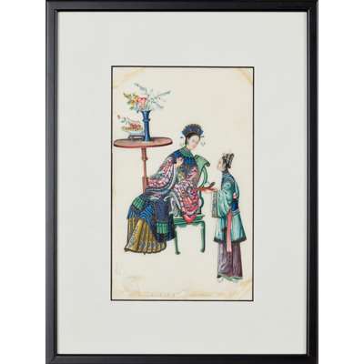 gouache on pith paper, four depicting seated courtly male and female figures accompanied by an attendant, other three of horizontal, each depicting an array of figures, framed