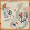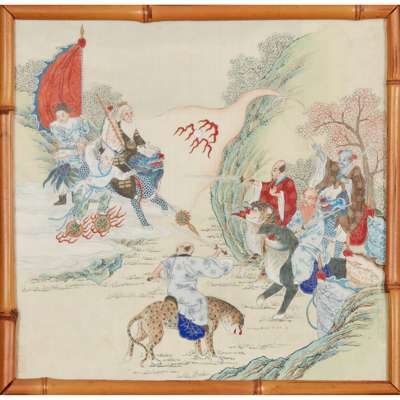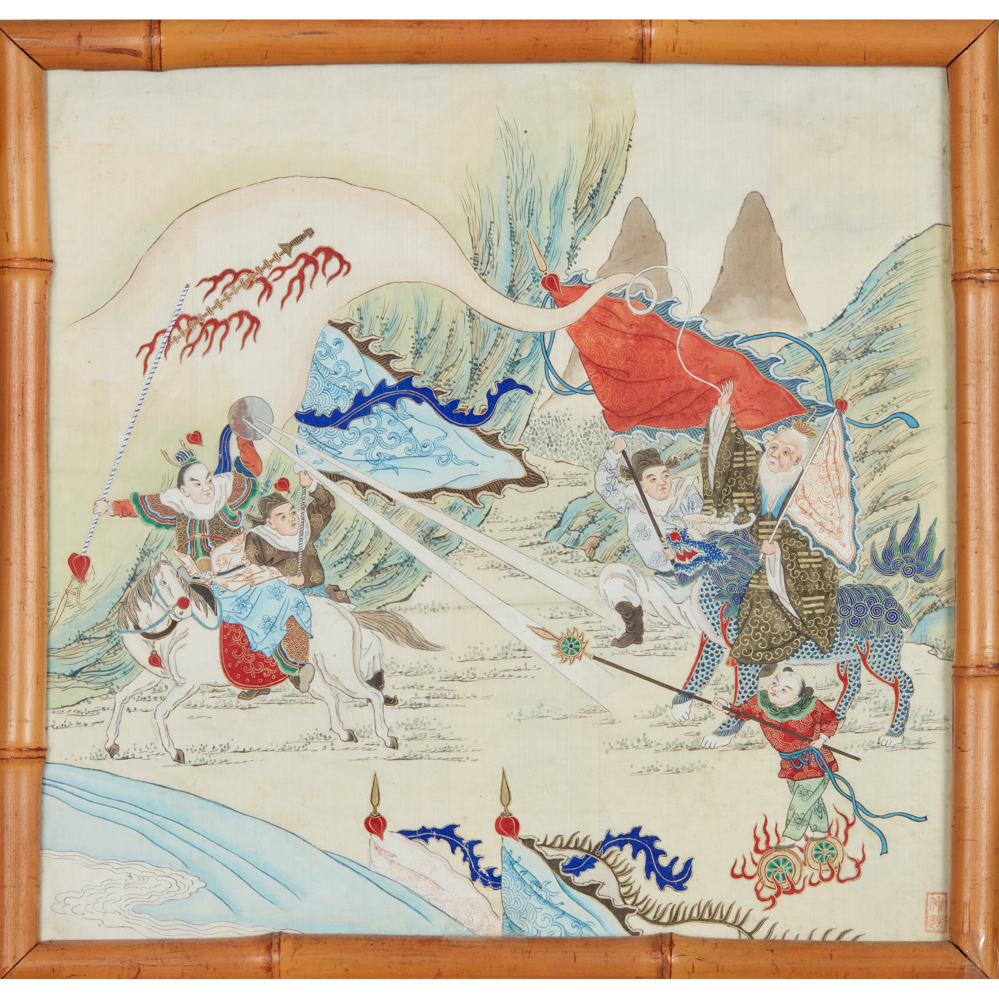 ink and colour on silk, both depicting scenes from classical fiction Fengshen Yanyi- Investiture of the Gods, one with Jiang Ziya and Nezha fighting Chi Jingzi who holds a Yin Yang Mirror as weapon, red seal on lower left; the other fighting four of the Seven Devils from Meishan- The Prunus Mountain, red seal lower right, both with bamboo frames
