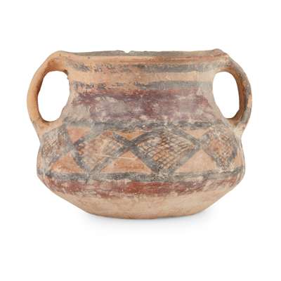 of compressed globular form with flared rim, flanked by two loop handles, painted on the body with geometric patterns