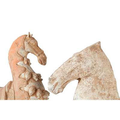 comprising: a pair of standing ladies, of Tang style, detailed in red pigment, 30.5cm high each; a Han-style dancing lady, with traces of green pigment, 25.1cm high; a Han-style torso of a horse, 36cm wide; a Wei-style caparisoned horse, 33.5cm high; and a head of a horse, 26.5cm high