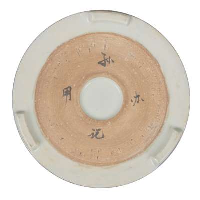 the sturdily potted cylindrical body supported on three short feet, the body finely painted with two qilins on swirling waves with underglaze blue, the exterior covered with a transparent layer of blue glaze, the base inscribed around the sunken base with a four-character 'Sun Ji Ban Yong (Made for the Sun Family)' in ink